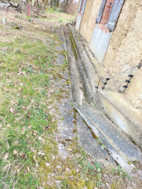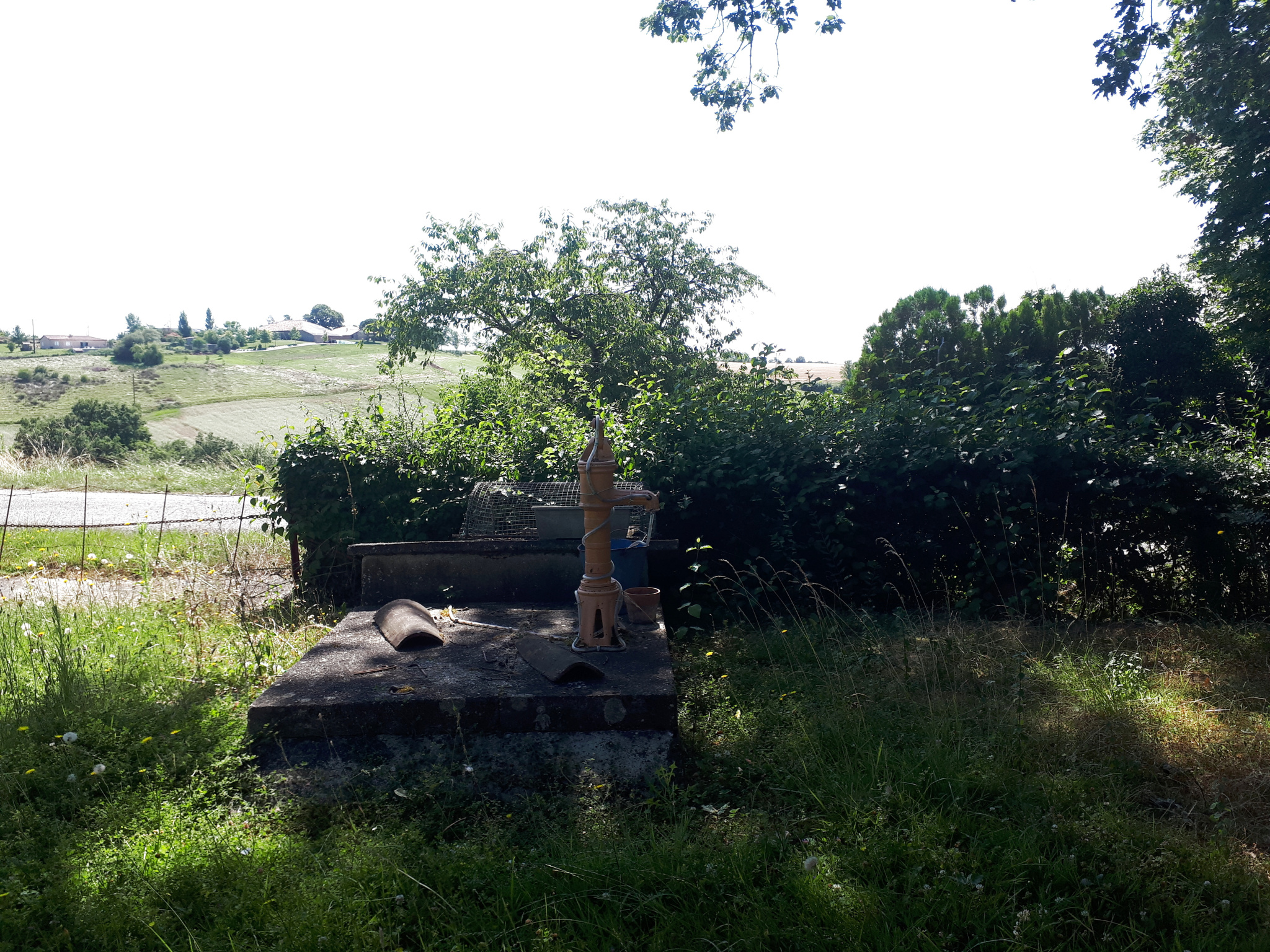 Une mare, qui retient l’eau toute l’année, avec une pompe alimentant un ancien potager