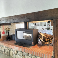 Cuisine équipée de 16m² avec poêle à bois vitré double face vers la salle à manger/ salon