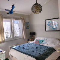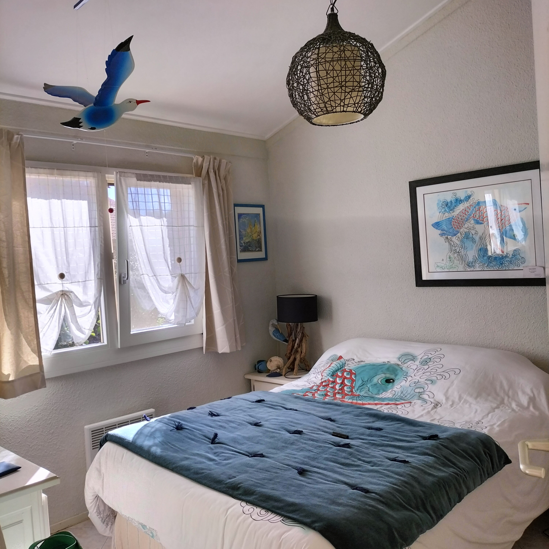 Le grand salon, doté d’un poêle à bois, est séparé de la zone nuit par une élégante porte vitrée, assurant lumière, confort et intimité.