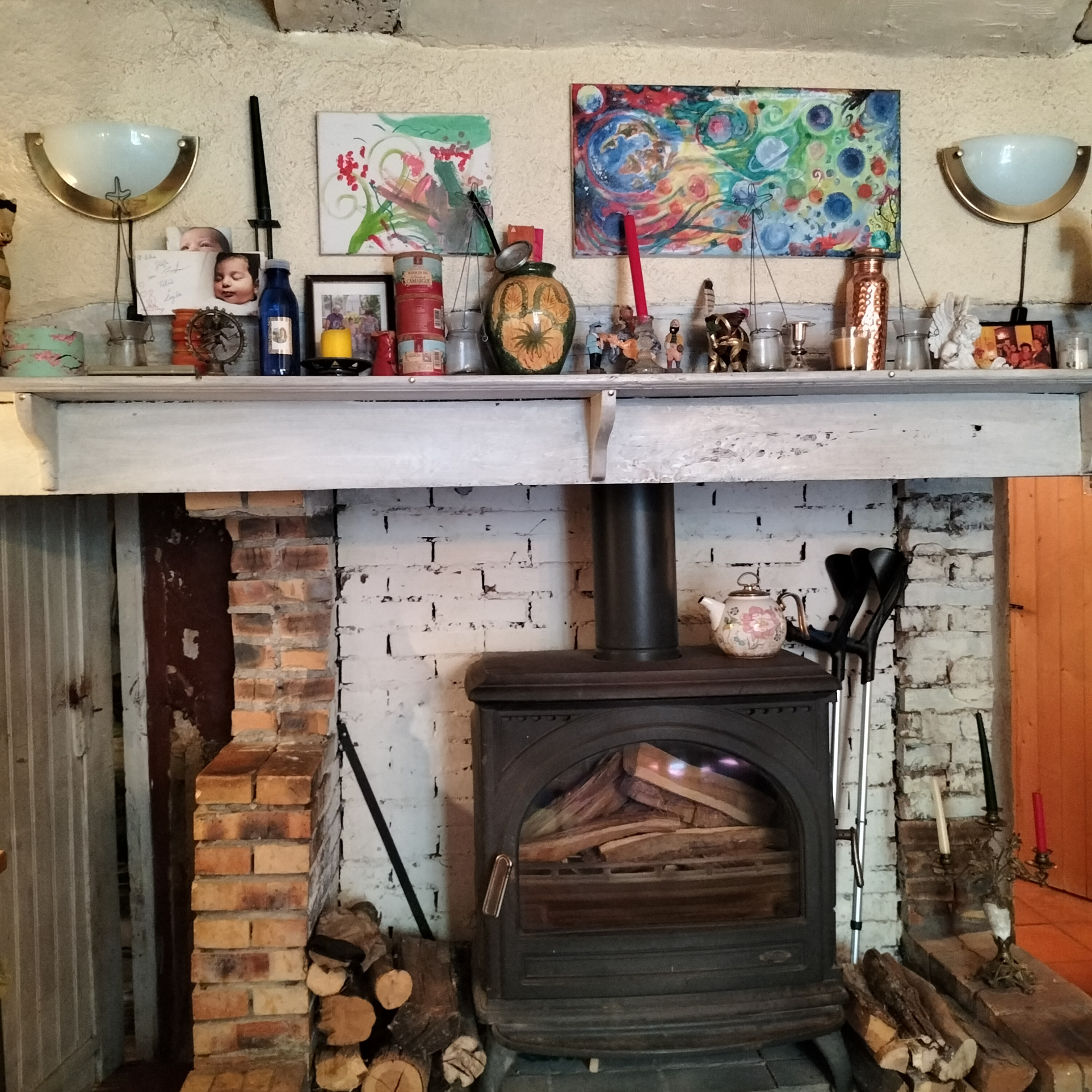 Un poêle à bois en fonte de marque Godin, d’une puissance de 7 kW, chauffe efficacement toute la maison grâce au conduit de cheminée.
